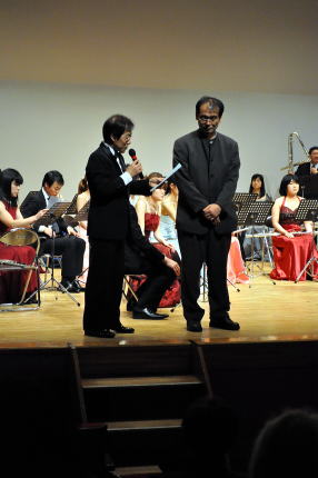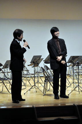 2013年3月16日(土)、札幌サンプラザホールで、札幌フルート協会主催の 「第6回スペシャルコンサート 〜踊り〜 」が開催されました。 コンサート後半では当協会会員の二宮毅氏・熊谷佳和氏の作品が演奏されました。 フルートオーケストラでは通常のオーケストラやアンサンブルでは目にする機会が 少ないバスフルートやコントラバスフルートも登場して、スケールの大きな演奏が ホールに響きわたりました。 ![]() リハーサル風景・「4」の字に見えるのがコントラバスフルート (左)「上昇する空気の流れを感じるような曲を」と二宮毅氏 (右)「"和のテイスト"で作曲しました」と熊谷佳和氏 ![]() |
